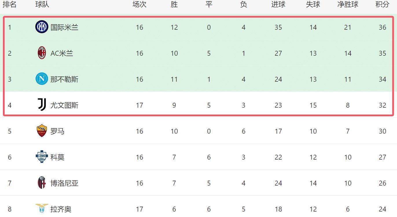?从目前的形势来看,本赛季意甲冠军,大概率将在国米、AC米兰、那不勒斯和尤文这4支球队当中产生,目前这4队就差4分。随着尤文近期在联赛豪取3连胜,他们已经杀回争冠集团。在斯帕莱蒂的带领下,尤文有机会竞争联赛冠军。