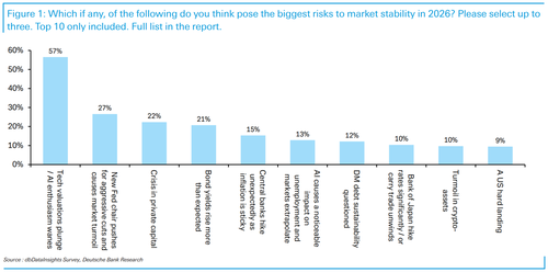 德意志银行最新客户调查显示,57%的受访者将科技泡沫破裂列为三大风险之首,创下单一风险选择比例的历史新高。